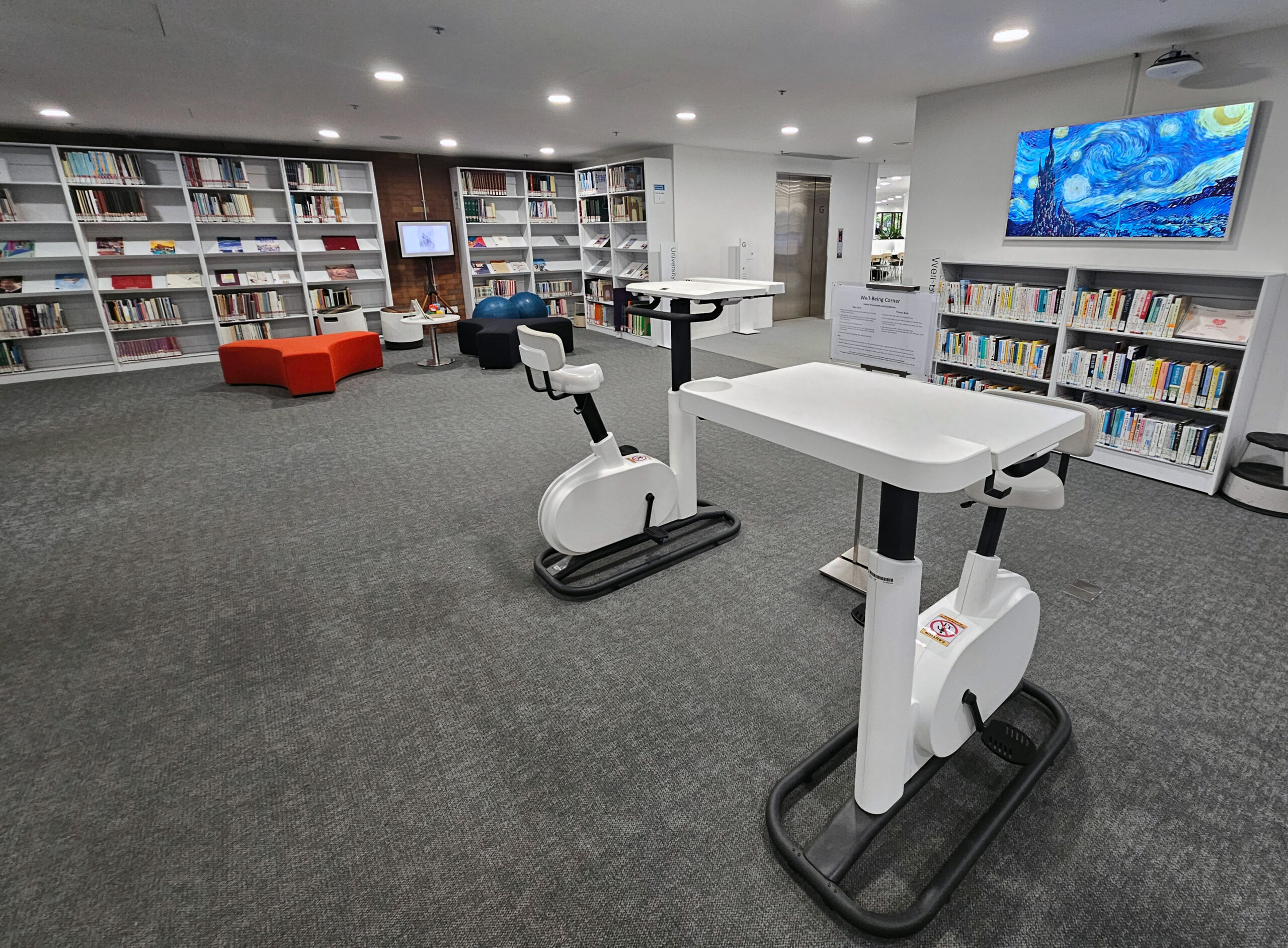 Get your blood flowing and boost your energy with a quick workout at the exercise bike desks. Combine physical activity with studying by pedalling while you read. - Fitness Balls: