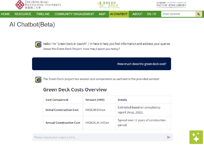 Launched in October 2025, this AI-powered system intelligently connects fragmented multimedia and contextual materials across collections related to PolyU’s proposed Green Deck Project. It dramatically improves retrieval relevance, uncovers hidden insights, and reveals new relationships across videos, presentations, and images. With this tool, you can easily explore the Green Deck’s rich digital resources, gaining valuable insights to support your learning and research.
