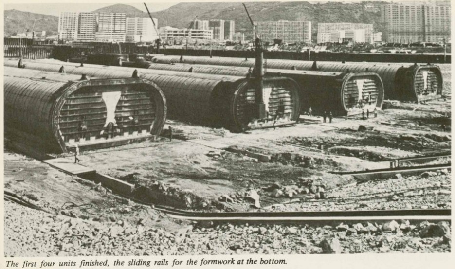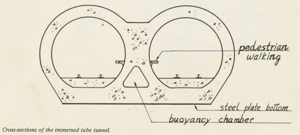 The immersed tube construction method was utilised, comprising twin-track units, each 100 meters in length, as illustrated below.